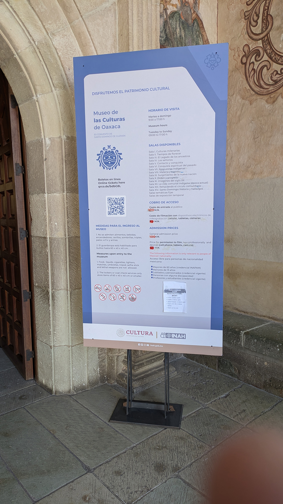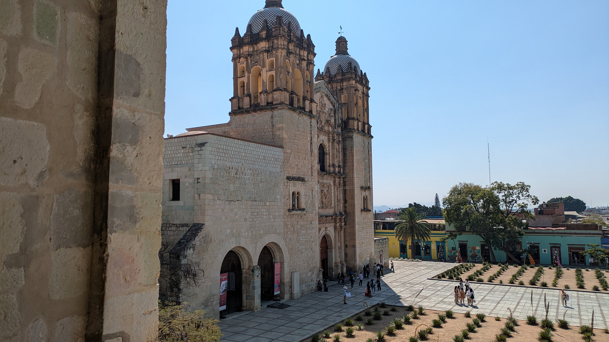 Eventualmente llegué a los corredores superiores que dan al Jardín Etnobotánico. Desde ahí, el diseño geométrico de las plantas crea un contraste llamativo con la pesada piedra de los muros del museo. La vista hacia la iglesia de Santo Domingo es una de las imágenes definitorias de la visita. Coloca al museo dentro de un paisaje más amplio y hace que el edificio se sienta conectado con su entorno en lugar de separado de él.