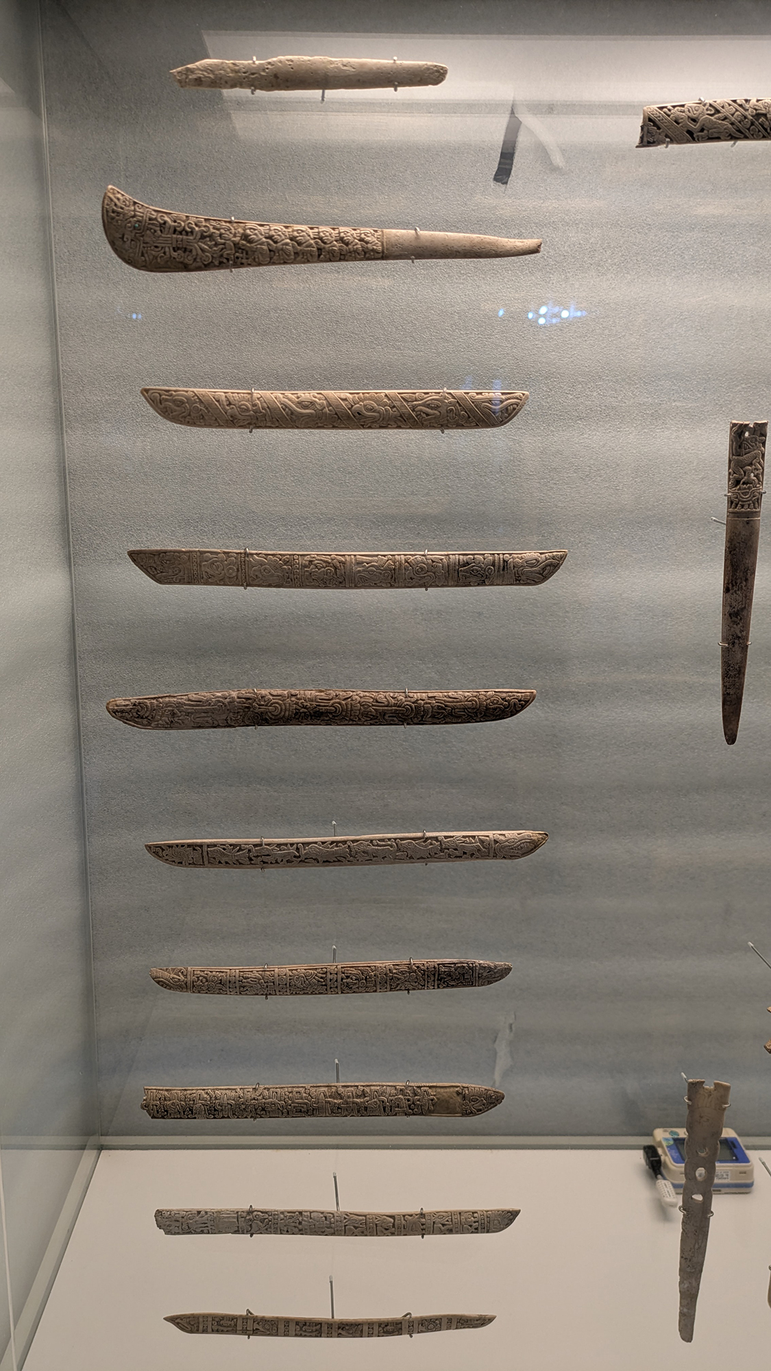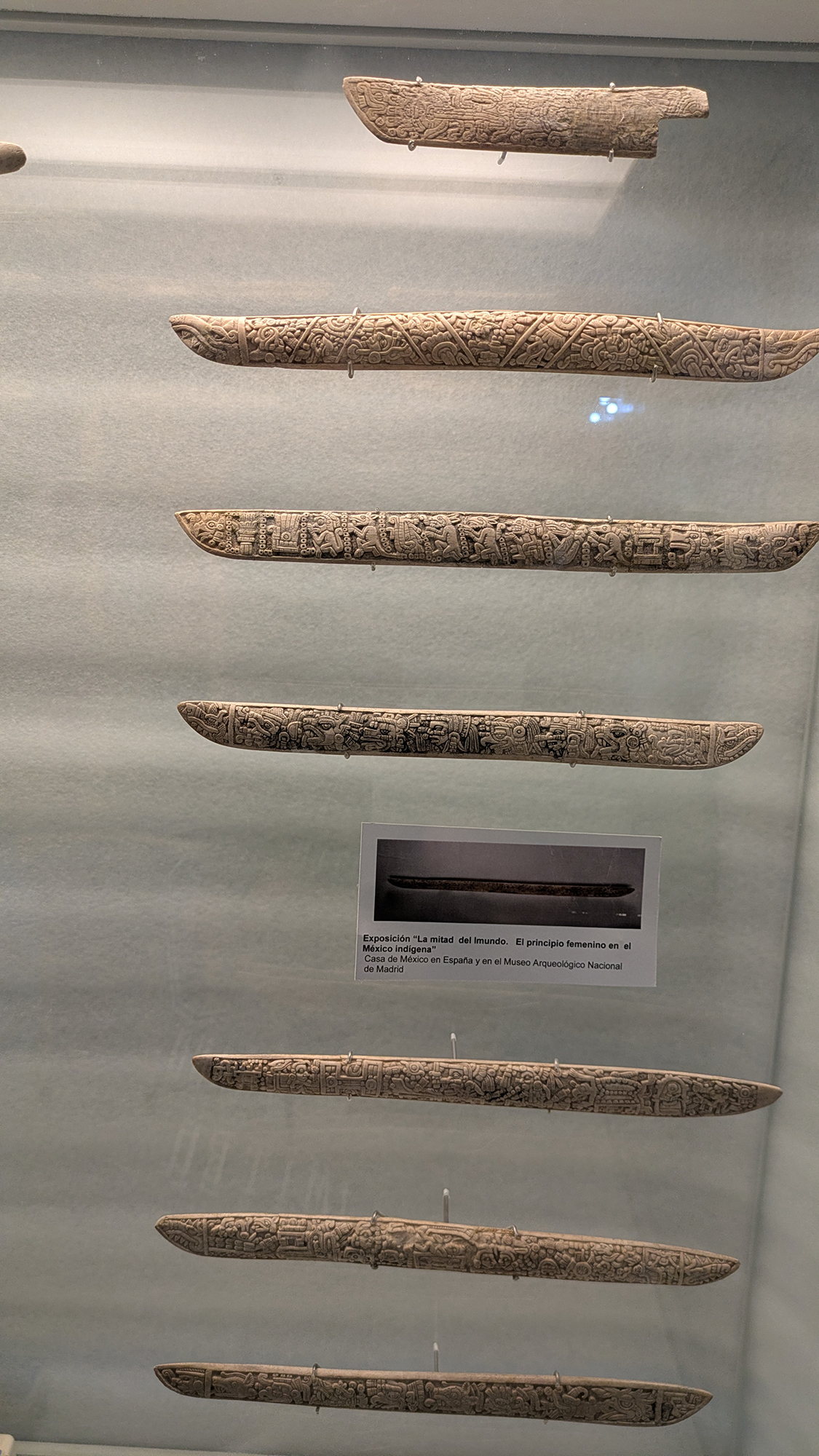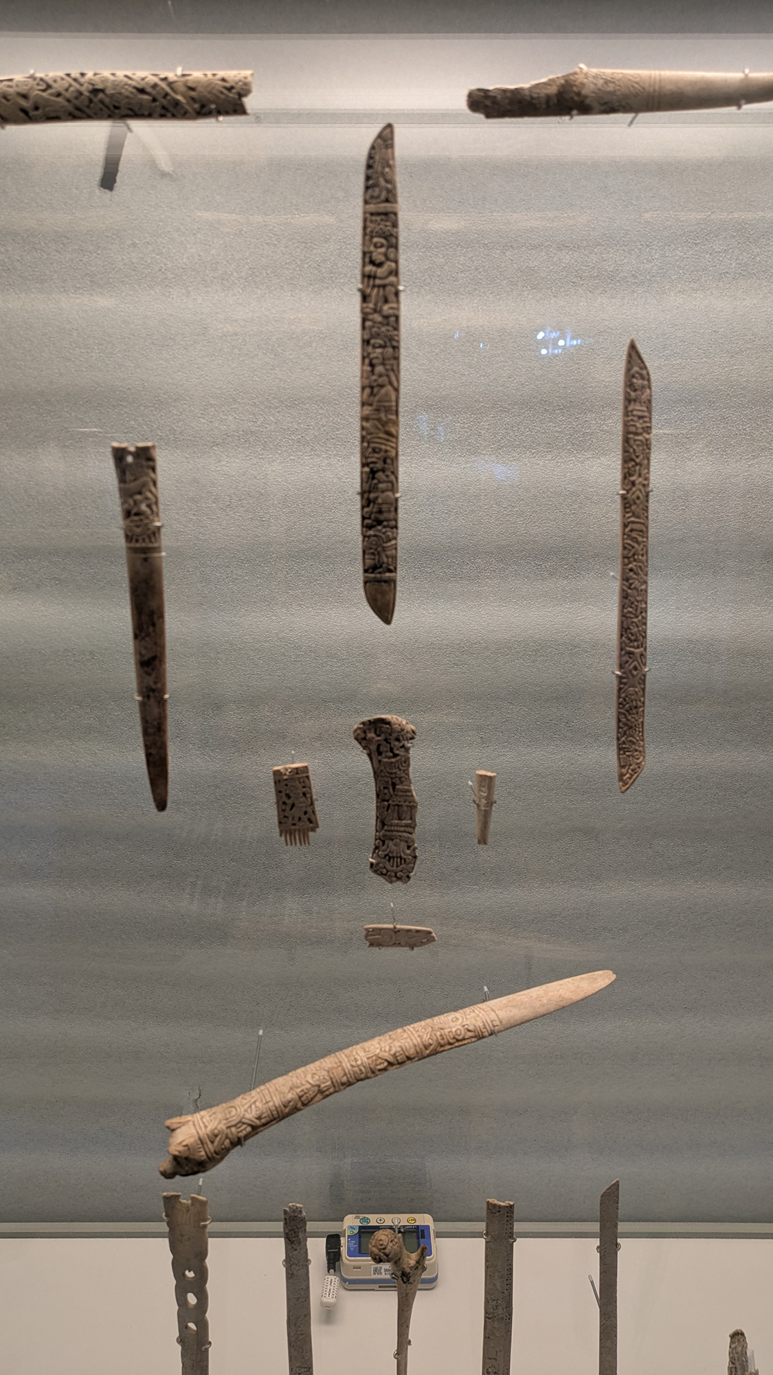 Las piezas que sí estaban ahí, sin embargo, tenían su propio peso. El cráneo incrustado de jade impacta de inmediato. Es el tipo de artefacto que invita a una mirada cuidadosa y sostenida. Cerca de él, efigies de barro y huesos tallados ofrecían una variedad de detalles silenciosos. Su manufactura se sentía deliberada, y la sala invitaba a un ritmo más lento para apreciarlos. La exhibición no abruma por su cantidad, pero sí ofrece una sensación de cercanía con los objetos mismos.