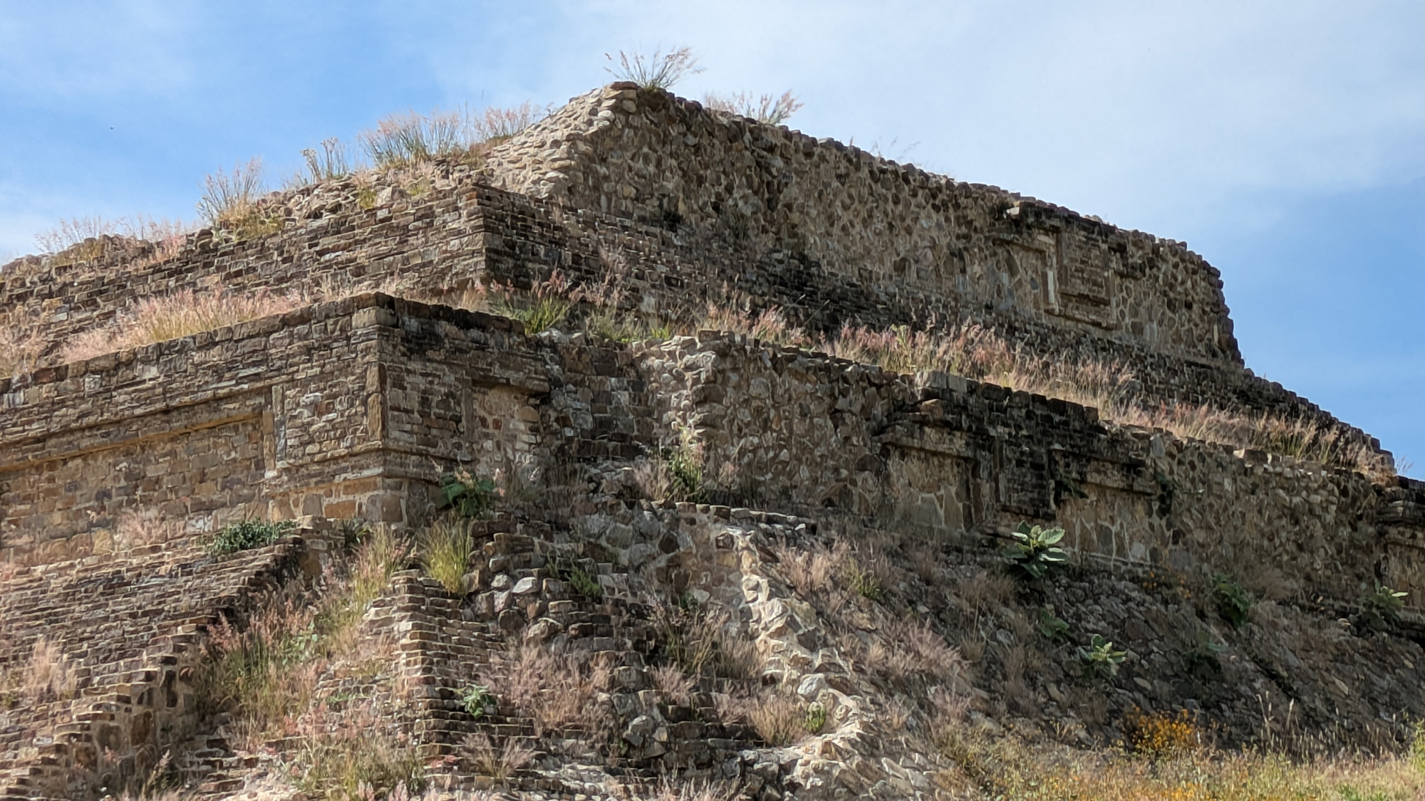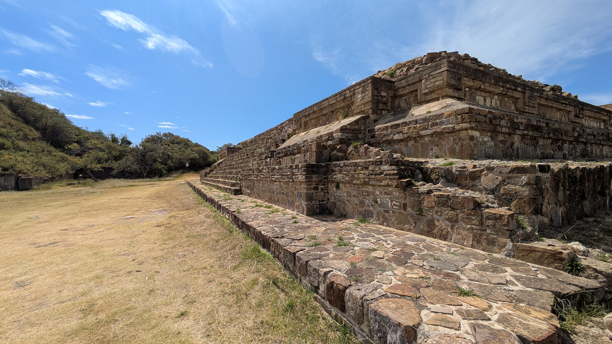 El Sistema M ocupa la esquina suroeste de la Gran Plaza de Monte Albán, en la fila occidental de las principales estructuras ceremoniales, que también incluye el Edificio de los Danzantes y el Sistema IV. El plano oficial del sitio del INAH identifica directamente al Sistema M en esta posición, inmediatamente adyacente al área de estelas del suroeste y próxima a la zona de la galería de los Danzantes [2]. El complejo está organizado como una disposición de templo-patio-templo. El componente oriental es el Edificio O, que funciona como la estructura frontal orientada hacia la plaza pública. Más allá de él se encuentra un patio cerrado con un altar o adoratorio central. En el lado occidental se eleva el Edificio M, el templo posterior de carácter más dominante. Las fotografías y comentarios de Mary Ann Sullivan son especialmente útiles aquí, porque muestran el complejo desde varios ángulos y dejan claro que el templo frontal es el Edificio O y la estructura posterior es el Edificio M, al tiempo que señalan que el Edificio M forma el muro sur del patio del Edificio de los Danzantes [5]. La disposición es significativa porque crea una transición desde el espacio público abierto hacia un espacio ceremonial restringido. Una persona que se acercara desde la Gran Plaza no entraría simplemente a un amplio patio abierto. Encontraría un umbral arquitectónico controlado, pasaría por encima de una estructura frontal elevada y accedería a un patio interior más resguardado, enmarcado por arquitectura templaria. Esta es una de las maneras más claras en que el Sistema M materializó la jerarquía en piedra.Arquitectura y construcción