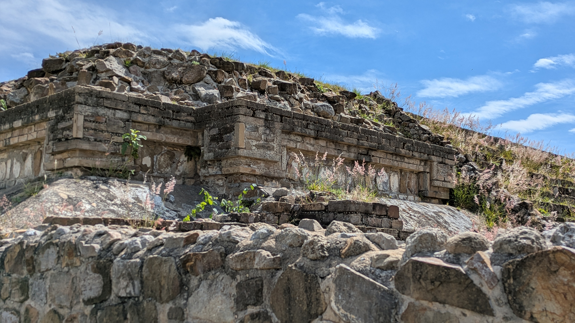 Como gran parte de Monte Albán, el Sistema M no fue construido en un solo momento. La forma monumental final visible hoy pertenece sobre todo a las fases maduras del Clásico, pero el área ya formaba parte de la zona ceremonial occidental desde mucho antes. La nivelación general de la meseta y la designación monumental del borde de la plaza se remontan al largo proceso de formación del sitio a partir de aproximadamente 500 a. C., mientras que las reconstrucciones del Clásico Tardío dieron a muchas de las estructuras visibles su forma definitiva [1] [3] [7]. Esto significa que el Sistema M debe entenderse de manera estratigráfica. Bajo la arquitectura visible había episodios constructivos anteriores, superficies más antiguas de la plaza y usos previos del lado occidental del recinto ceremonial. Esta historia acumulativa es fundamental. La Gran Plaza de Monte Albán no fue diseñada una sola vez para quedar congelada para siempre. Fue revisada repetidamente a medida que cambiaban las necesidades políticas y ceremoniales de la ciudad.Relación con el Edificio L y el sector de los Danzantes